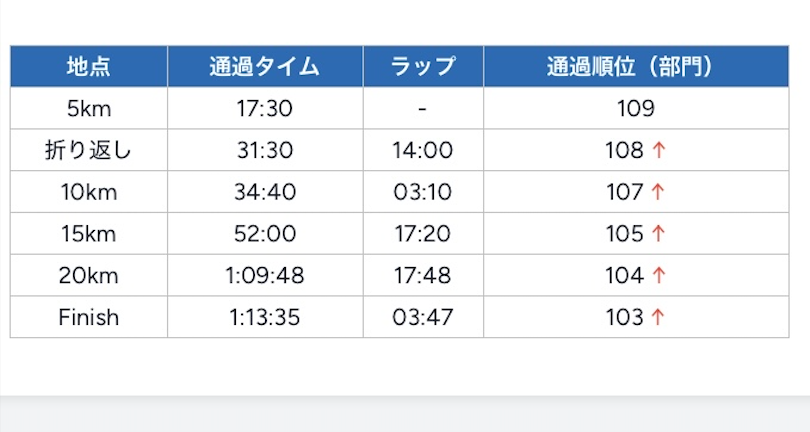 記録は1時間13分35秒。予定よりも走れて、思ったより体力が早く戻ってきたというべきか、驚きがありました。