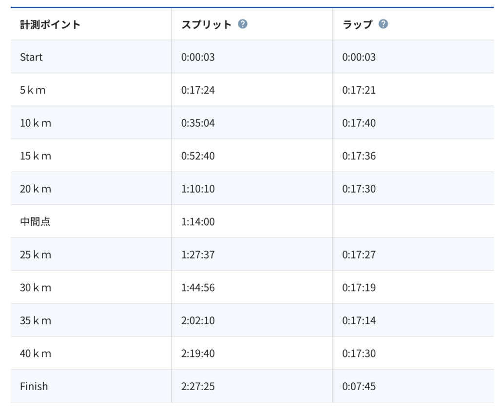 2時間27分25秒。なんとか目標達成です。ただ目標達成の喜びというよりは、きつさから解放された安堵感が大きかったです。